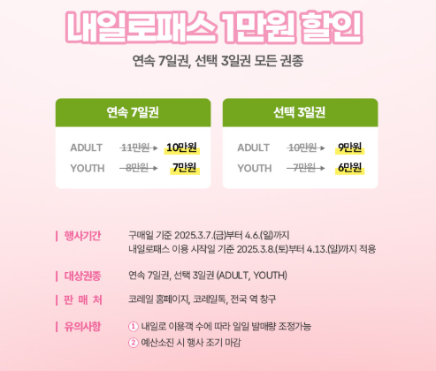 자유롭게 철도를 이용할 수 있는 <내일로> 패스도 이번 행사에서 할인 판매된다. 기존 가격에서 1만 원 할인된 가격으로 제공되며, 연령대에 따라 'Adult권'과 'Youth권'으로 나뉜다.